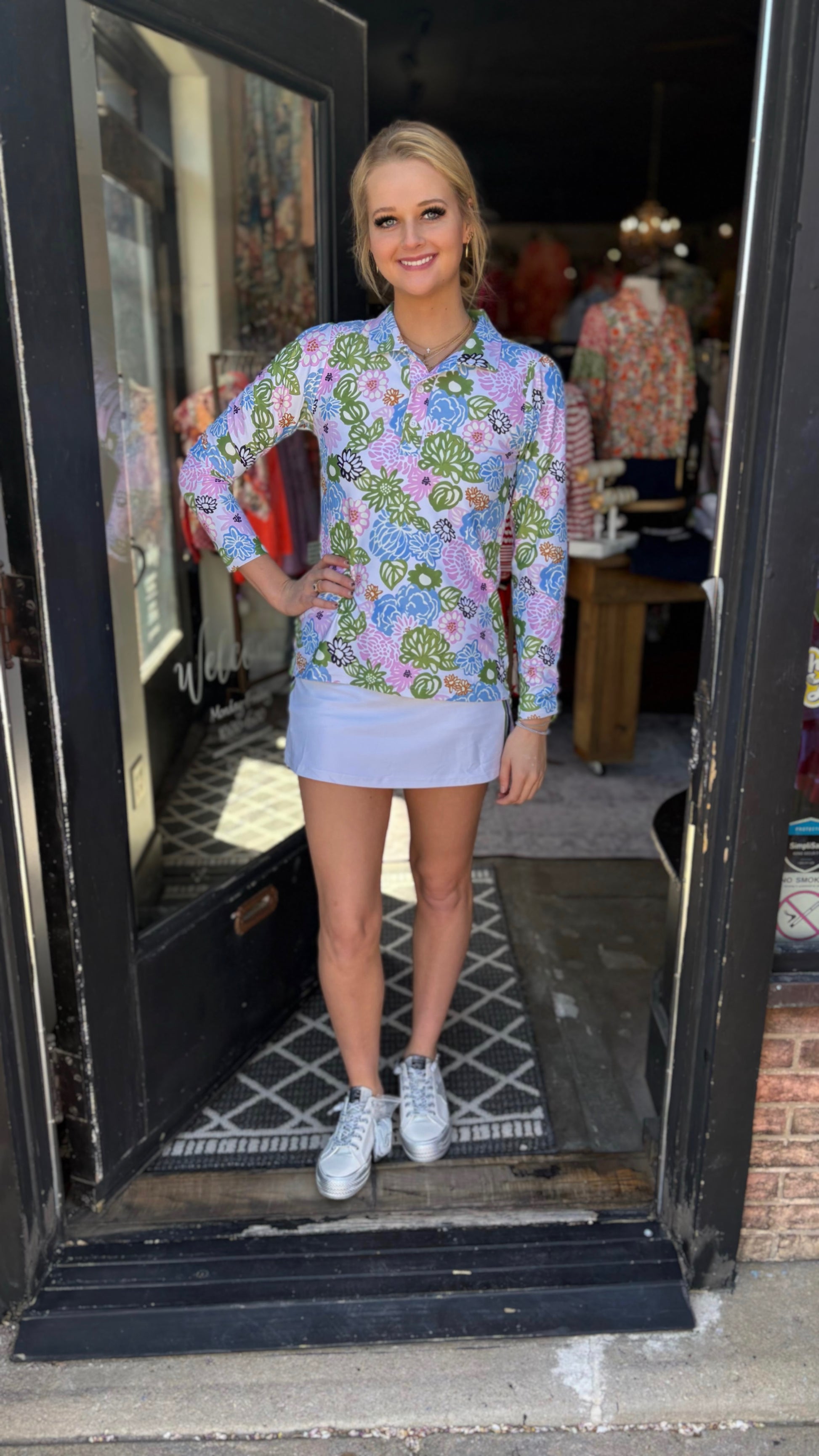 Stay stylish on and off the course with this vibrant floral performance top. Featuring a bold mix of pink, green, blue, and lavender blooms, this long-sleeve polo blends sporty structure with playful flair. The breathable fabric and flattering fit make it perfect for active days, whether you're hitting the golf course or running weekend errands in style.