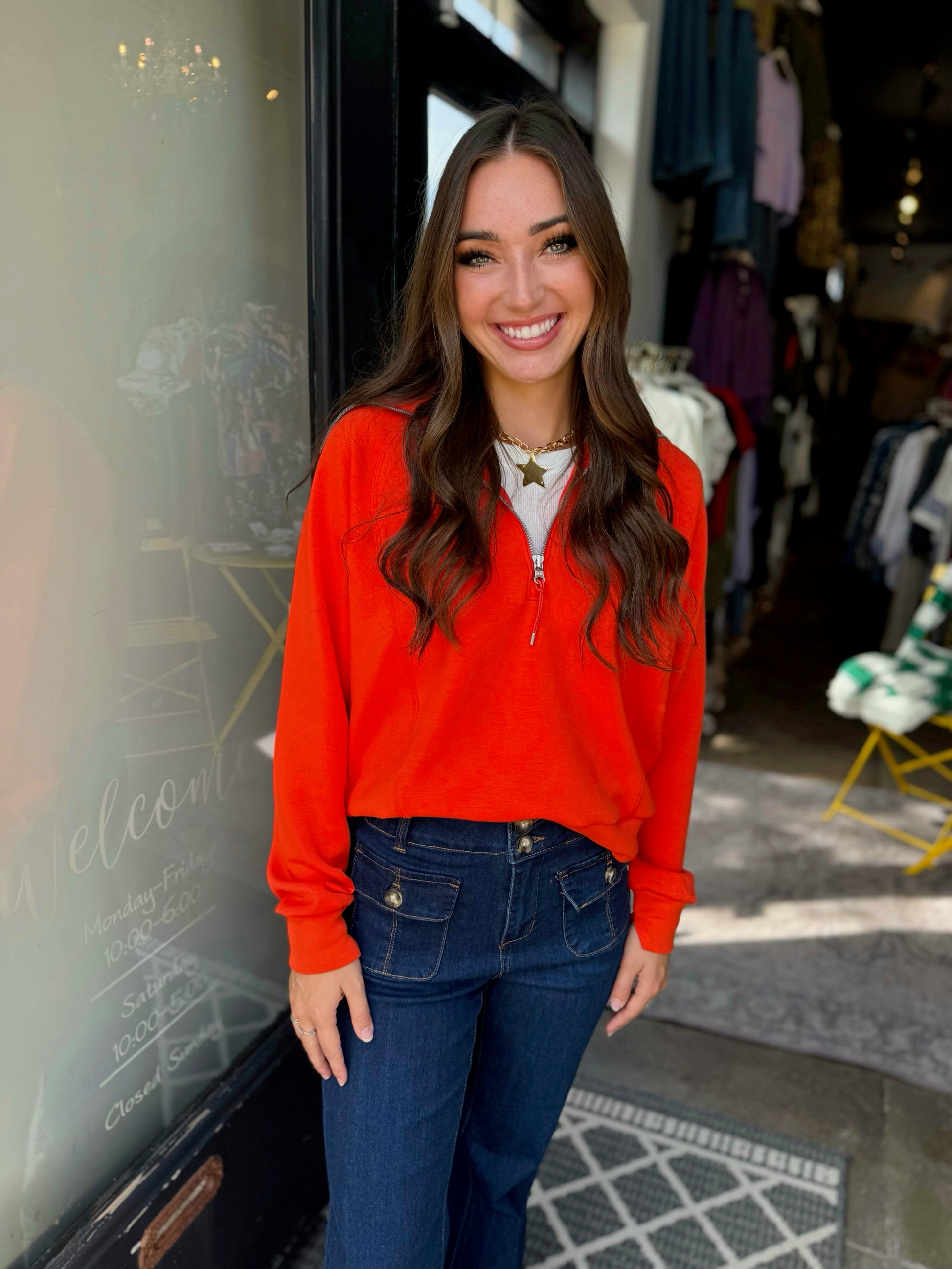 Add a bold pop of color to your wardrobe with this vibrant half-zip sweatshirt! Featuring a relaxed fit, soft fabric, and sporty neckline, it’s perfect for staying cozy while keeping your look effortlessly chic.