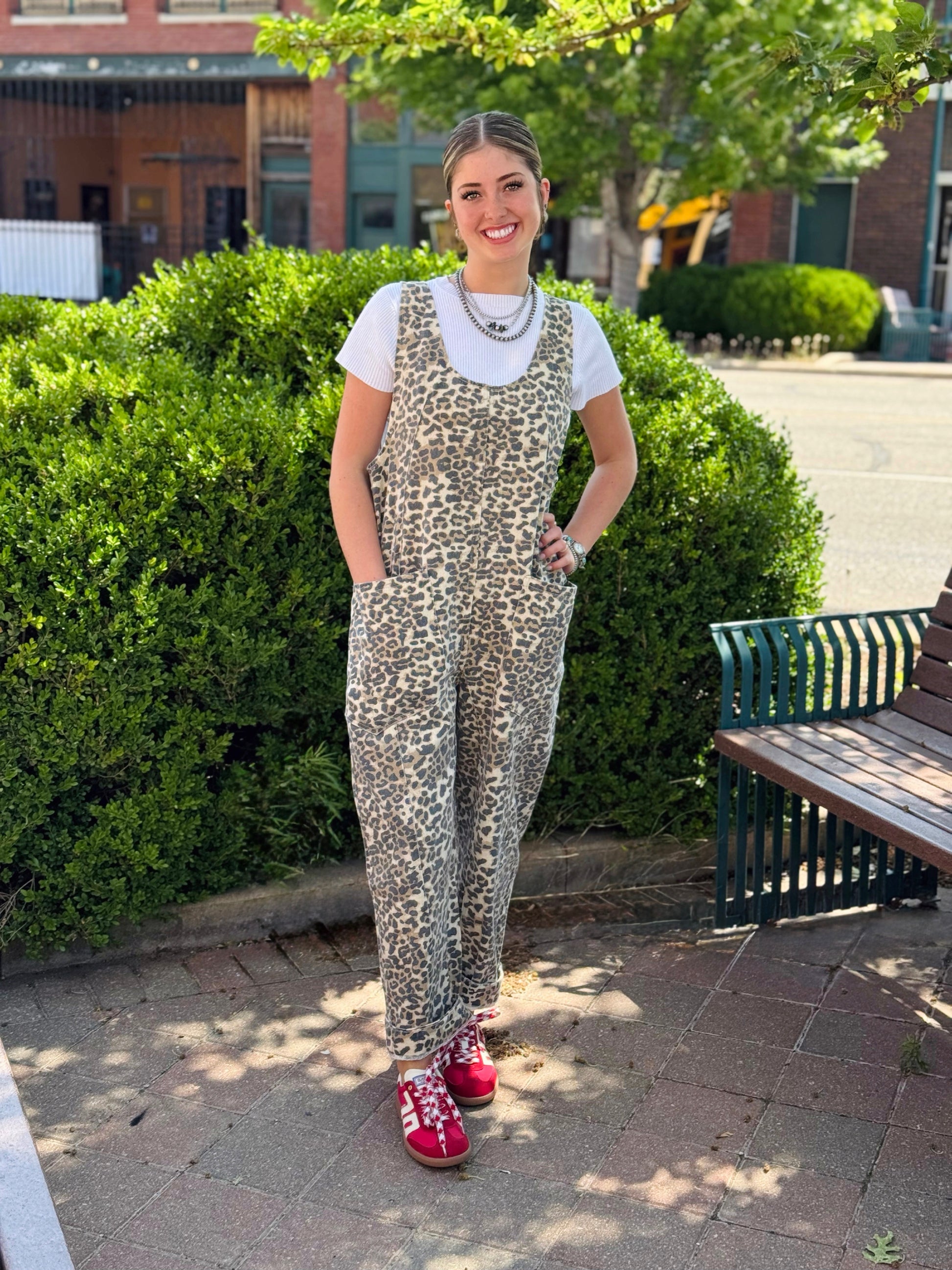 Make a bold statement in this relaxed leopard print jumpsuit, featuring wide legs, oversized pockets, and a comfy, easy fit. Perfect for layering over a tee for a casual-cool vibe you’ll love all season!
