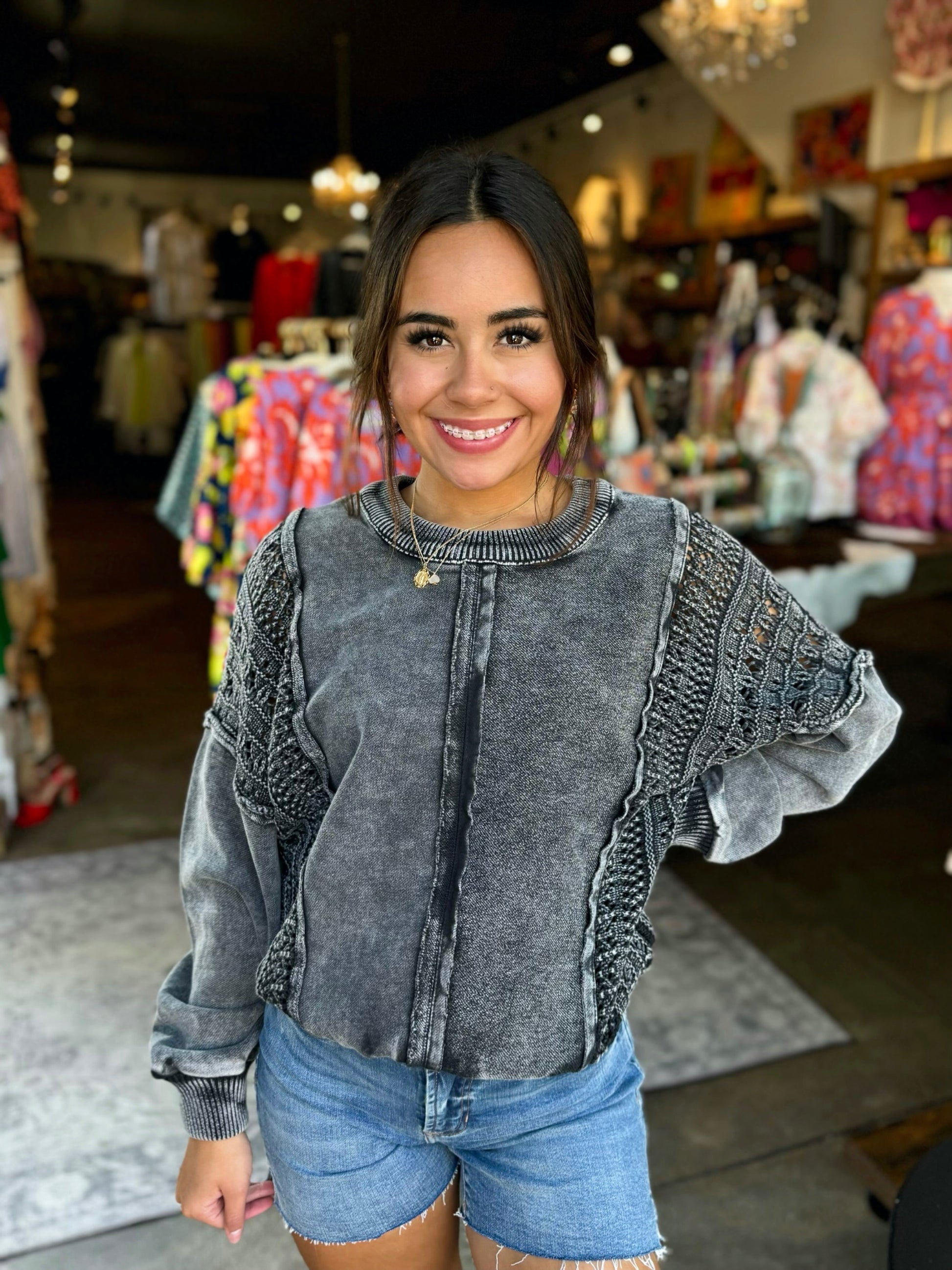 Blending stonewash French terry fabric with crochet accents, this pullover has style and comfort in equal measure! It features a wide crew neck, relaxed fit, with an exaggerated drop shoulder with the raglan sleeves.