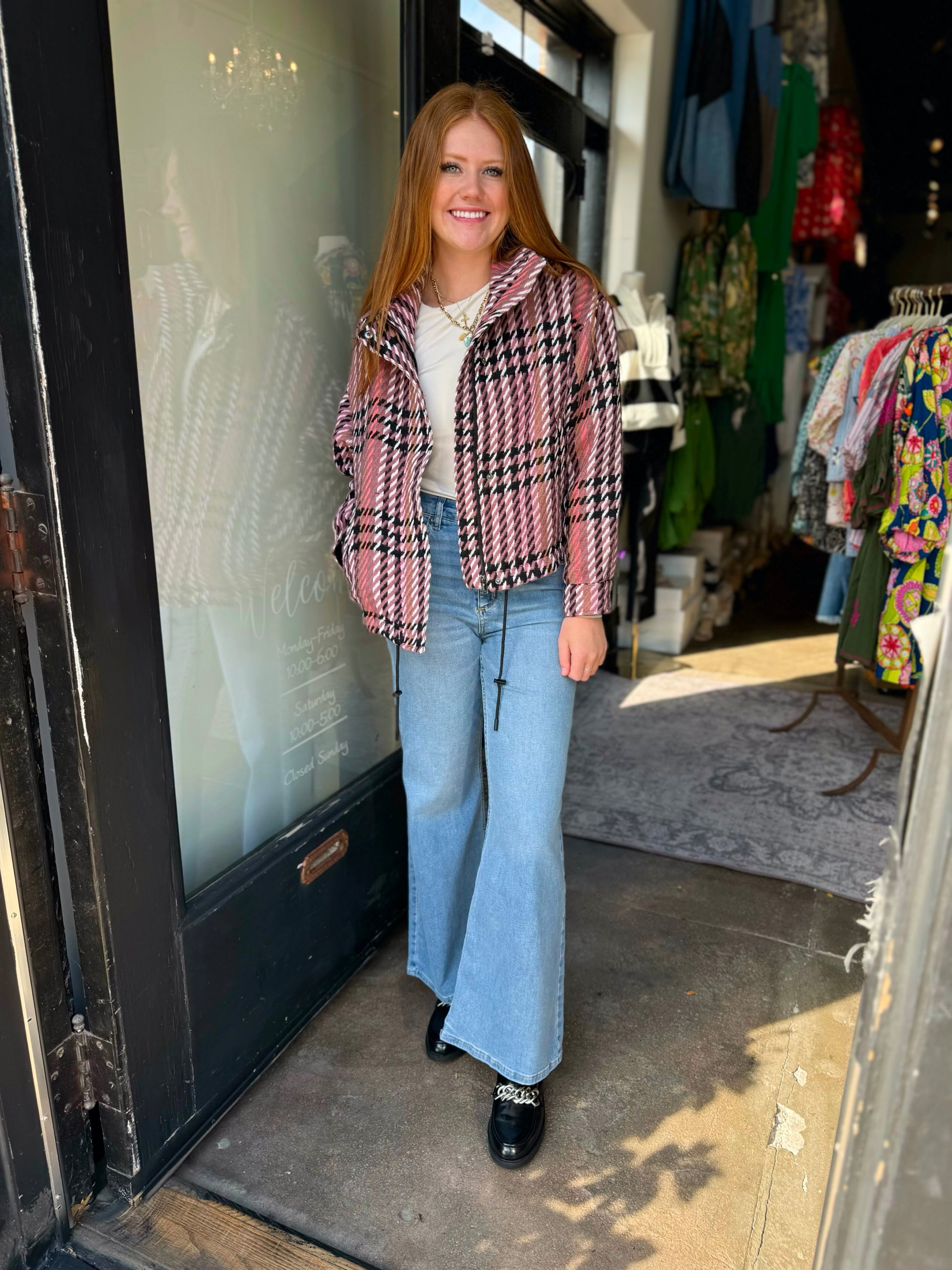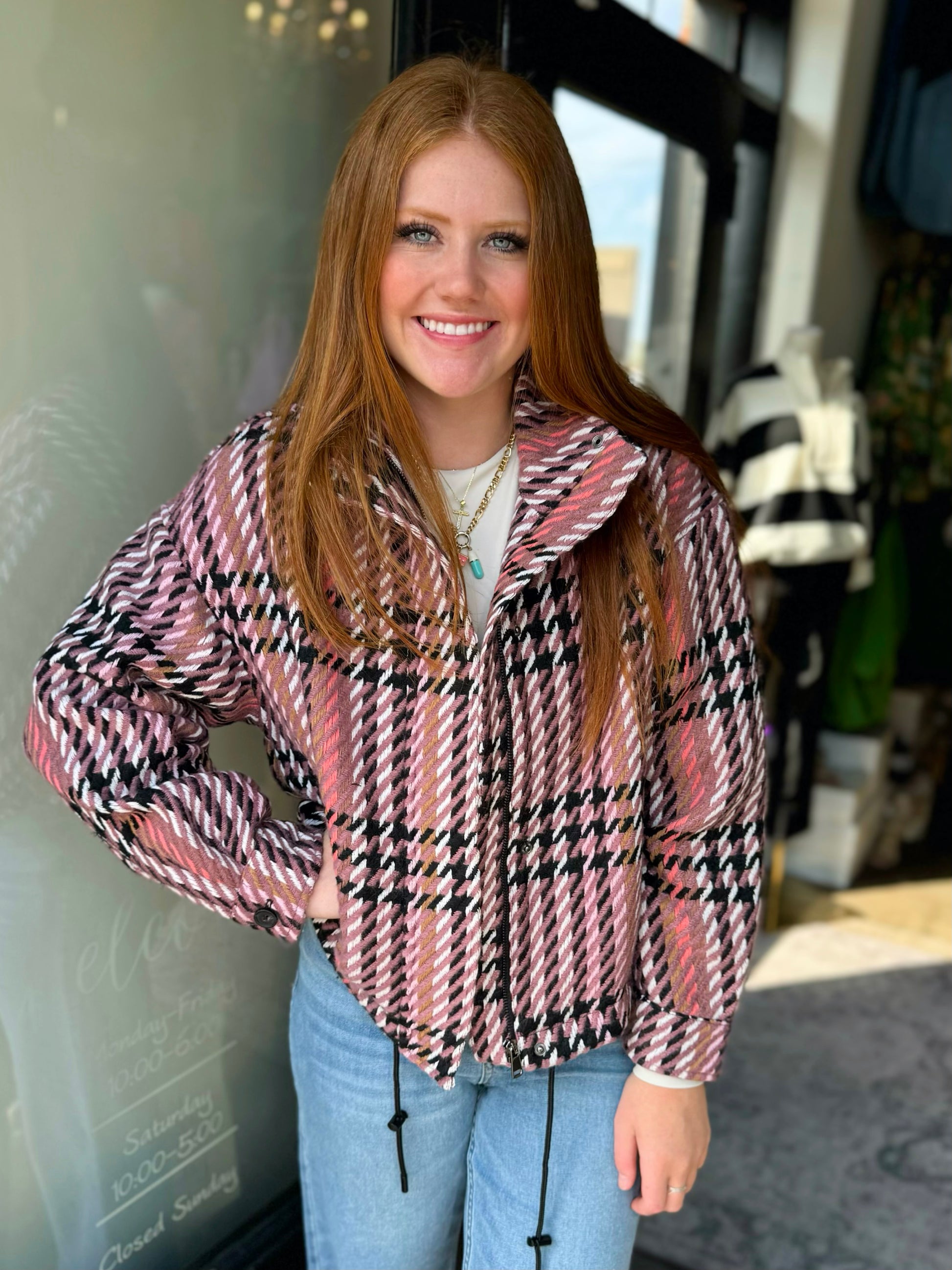 Brave cold weather in style by opting for this zip-up jacket featuring yarn-dye fabric with a plaid pattern. It features a mock neckline, functional welt pockets and faux leather accents.