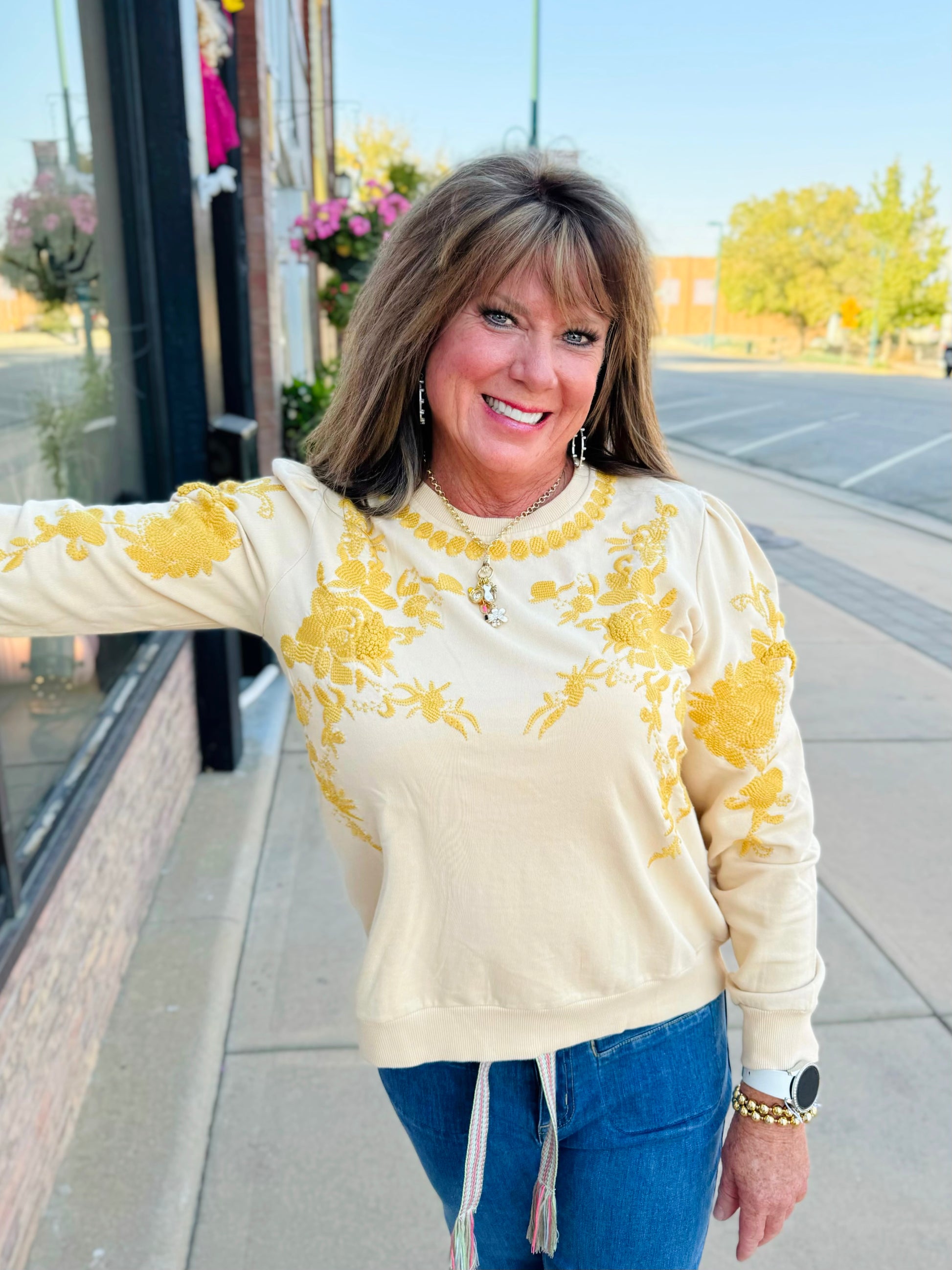 This classic crewneck top features delicate hand-stitched embroidery along with subtly puffed long sleeves with cuff seams and ribbed finishing for any occasion!