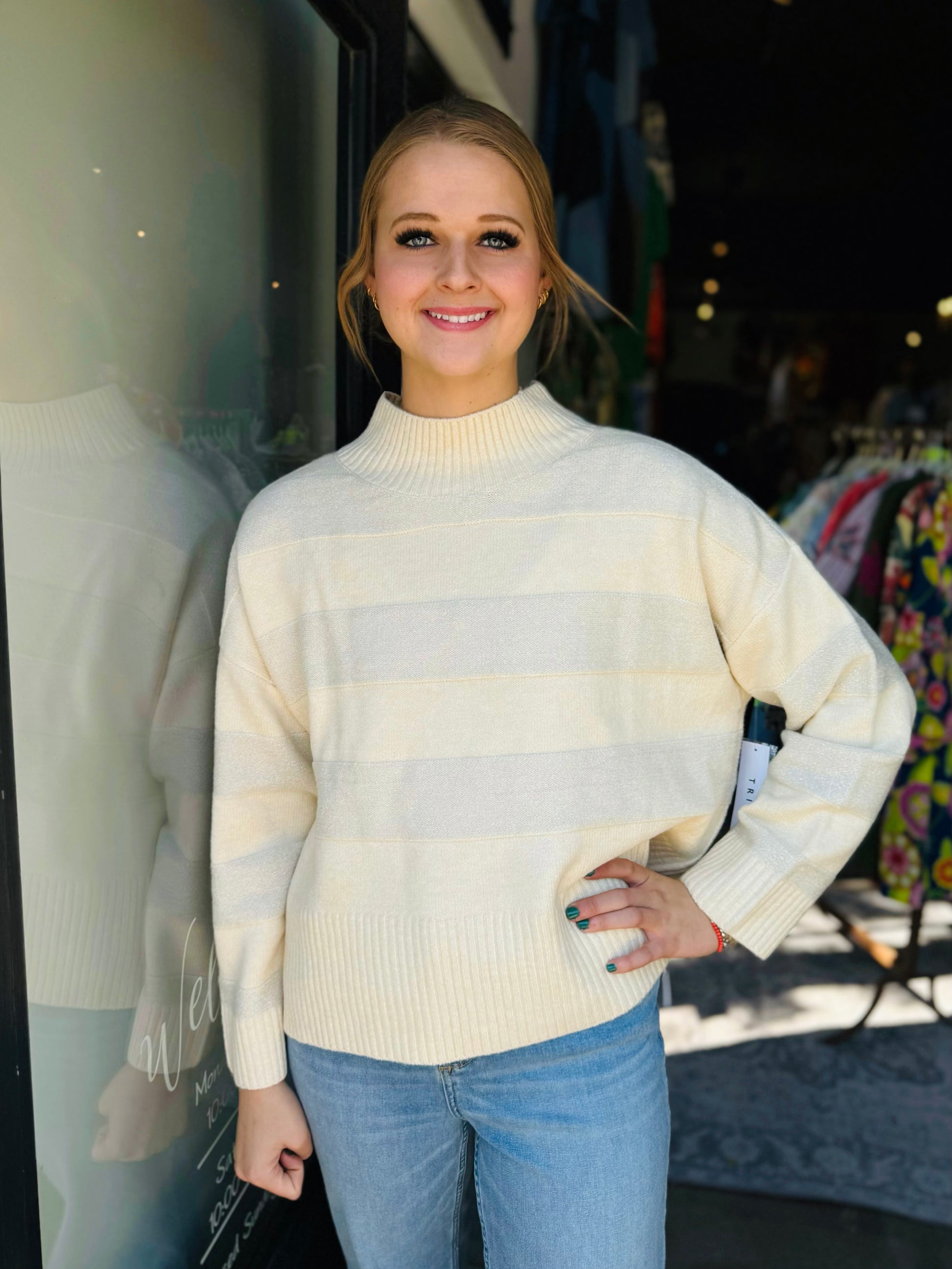 Your perfect staple classic cream sweater! This sweater features a mock neck with subtle horizontal striped detailing, and textured cuffs, and neckline. You can’t go wrong with this piece!