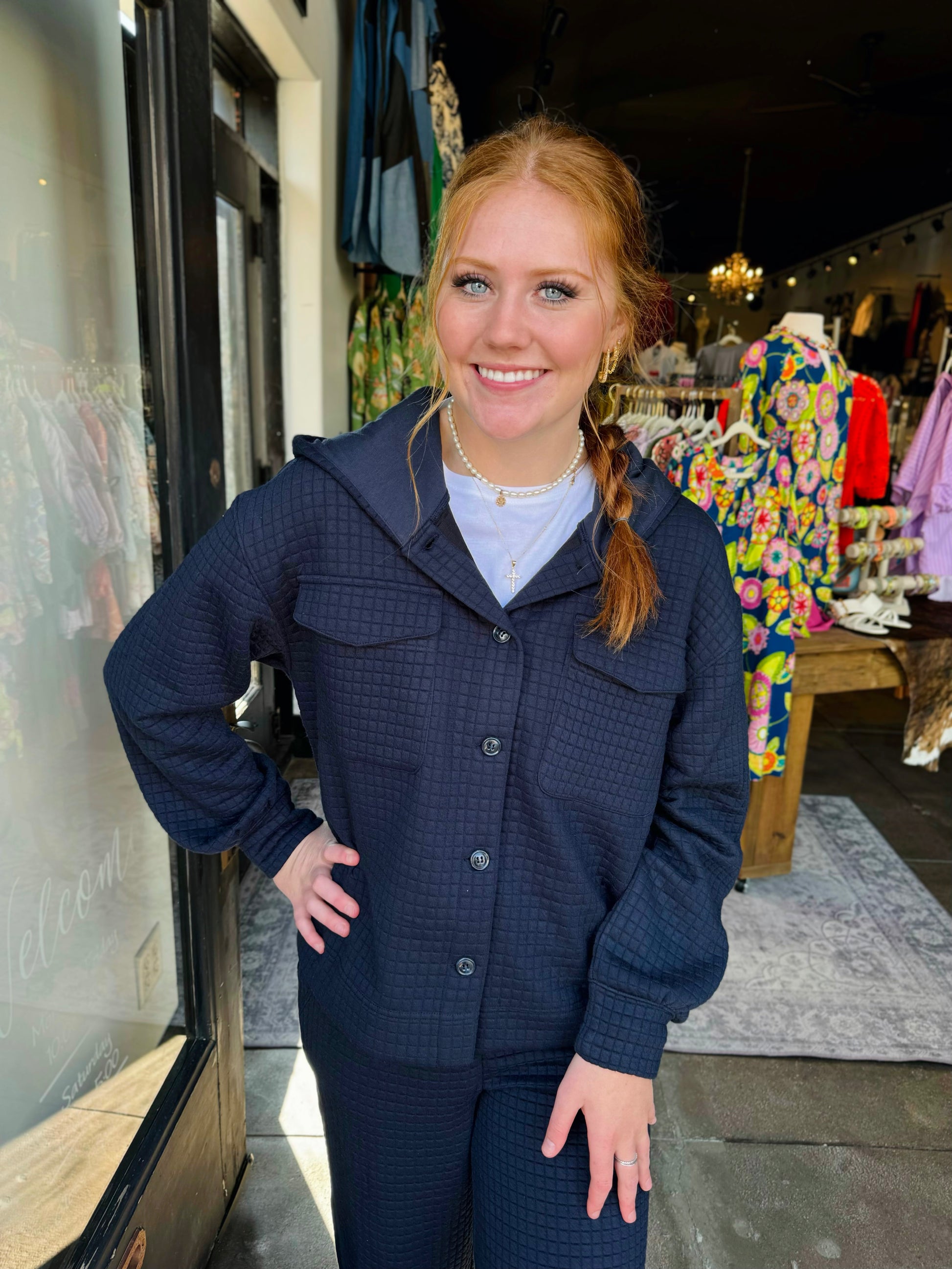 Revamp your on-the-go style with this lightweight hooded jacket cut from quilted knit fabric. It features a button-up front, flap-top chest pockets with a hidden snap closure, and light sheering at the cuff seams.