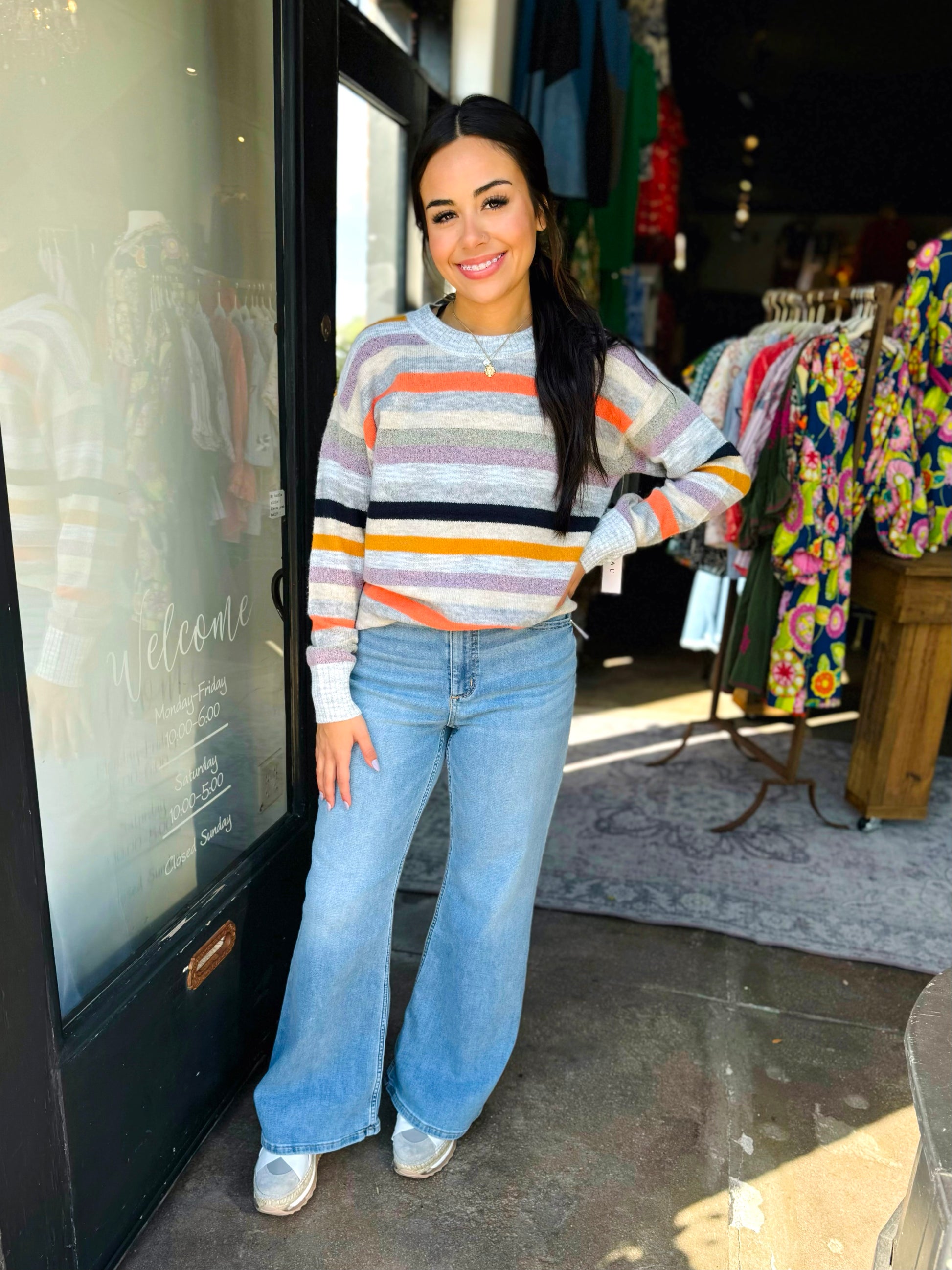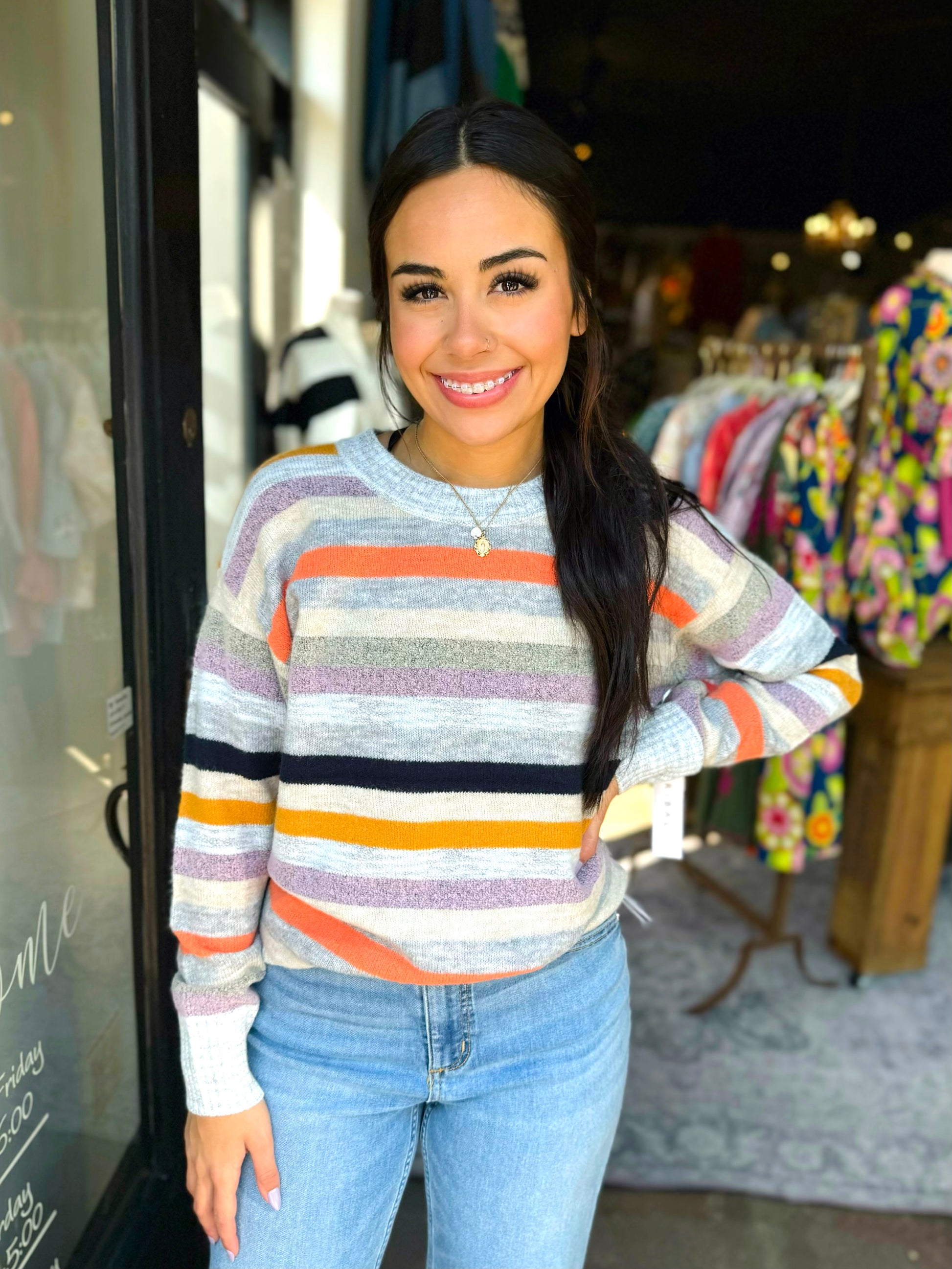 This stunning striped sweater is the perfect everyday fall staple this season. Dress up or down, you can’t go wrong with this classic crewneck sweater featuring a pop of color!