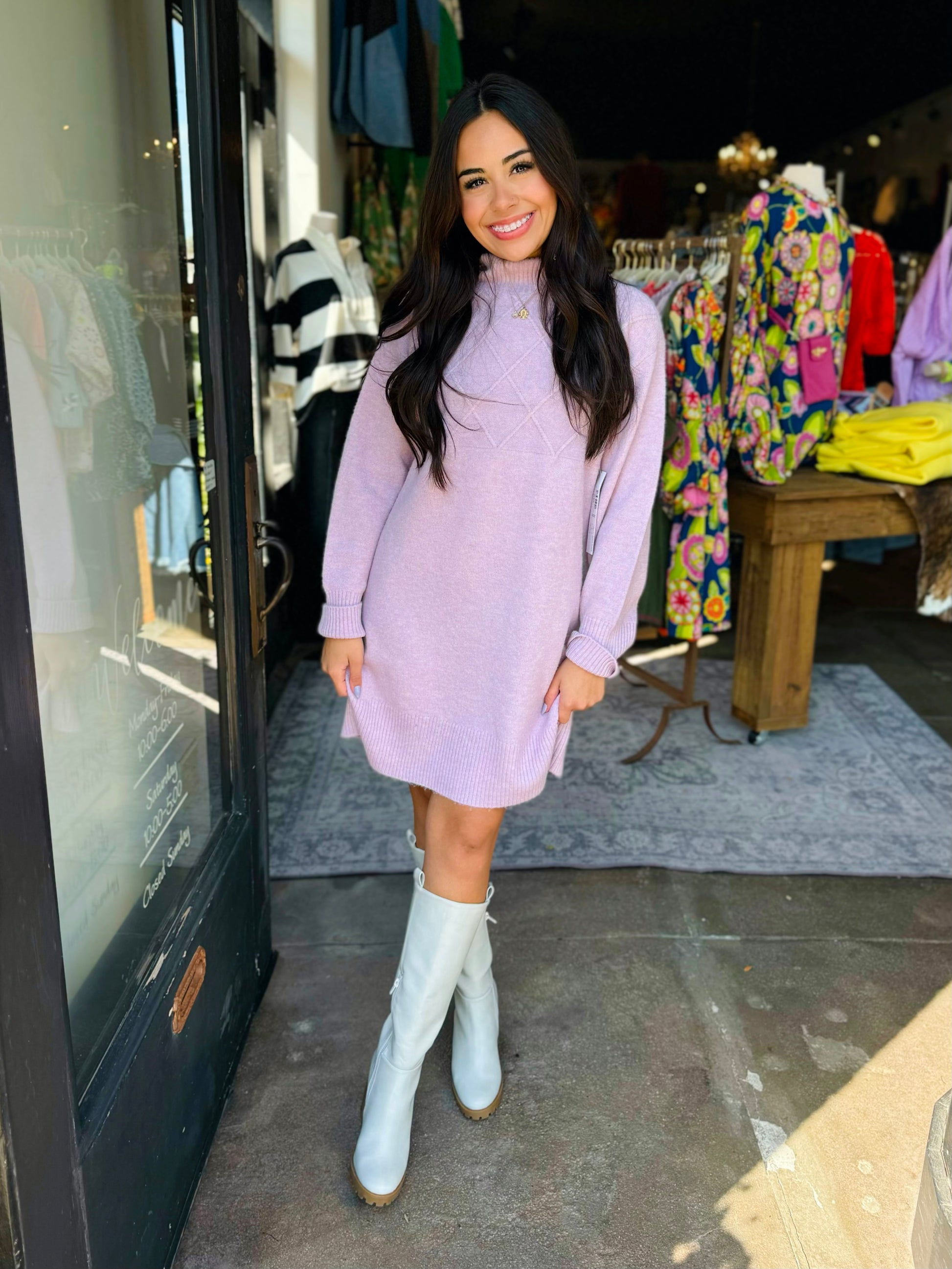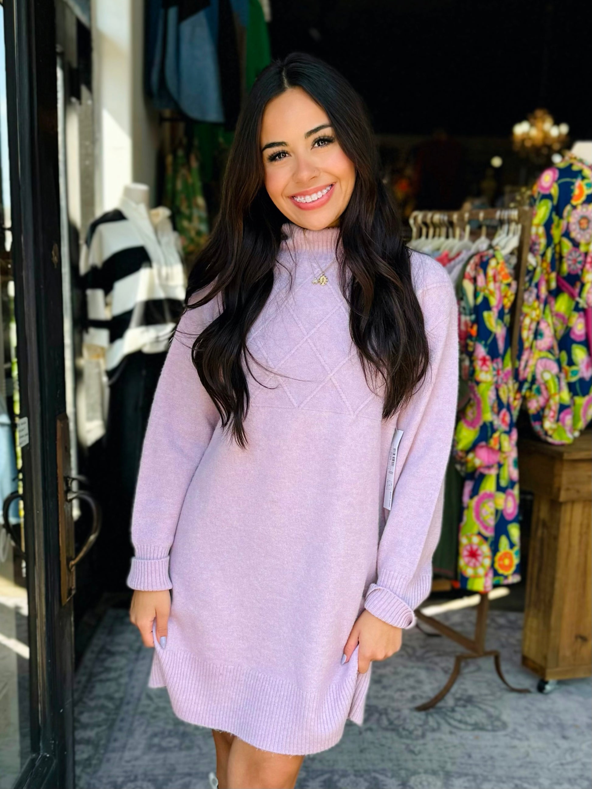 What lavender dreams are made of! This gorgeous sweater dress features a mock neckline, quilted detail, and long sleeves.