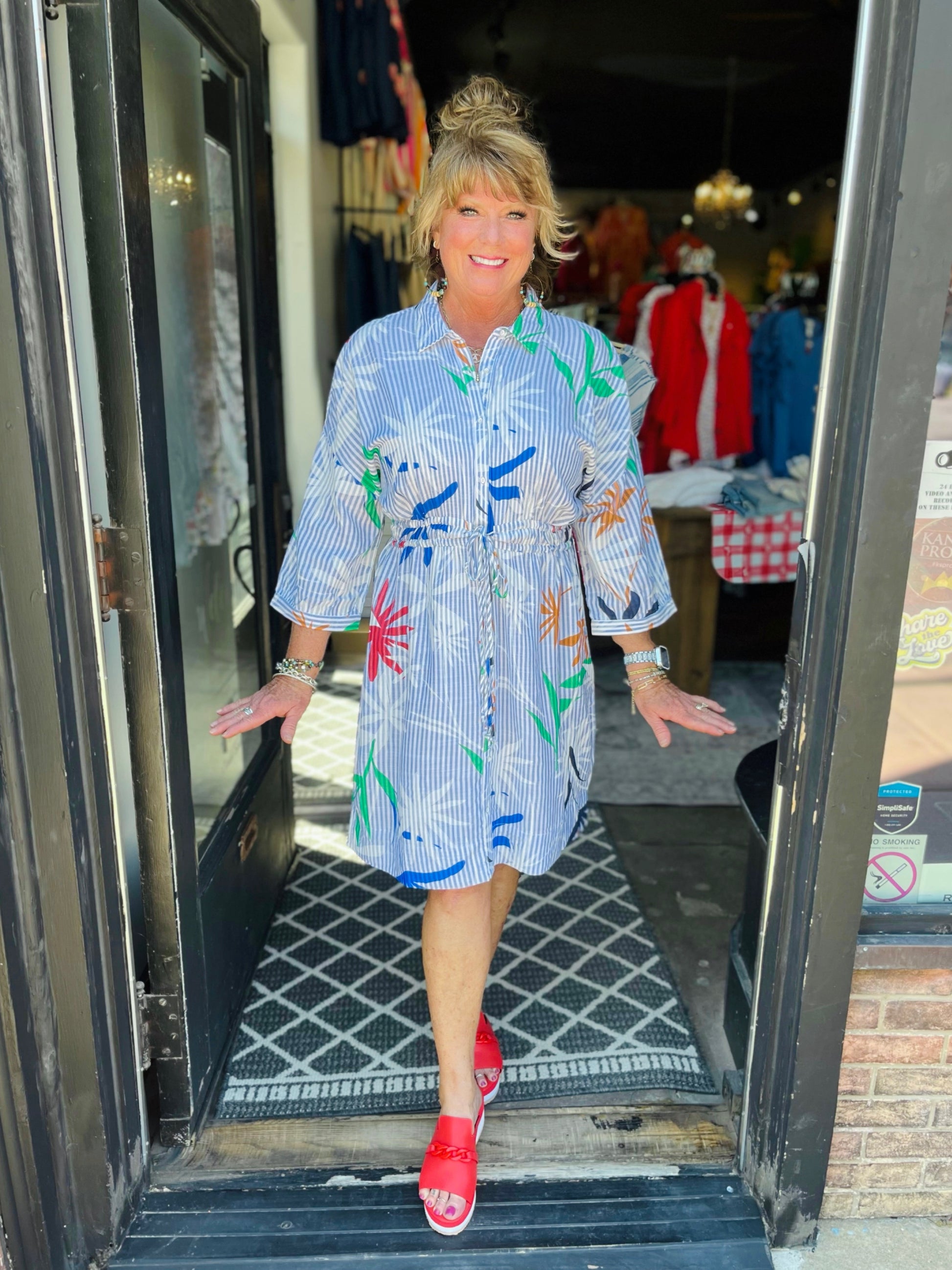 Brighten up your wardrobe with this playful, button-down shirt dress featuring classic blue and white stripes accented by bold, colorful floral prints. With a cinched waist for a flattering fit and relaxed 3/4 sleeves, it's the perfect blend of comfort and charm!