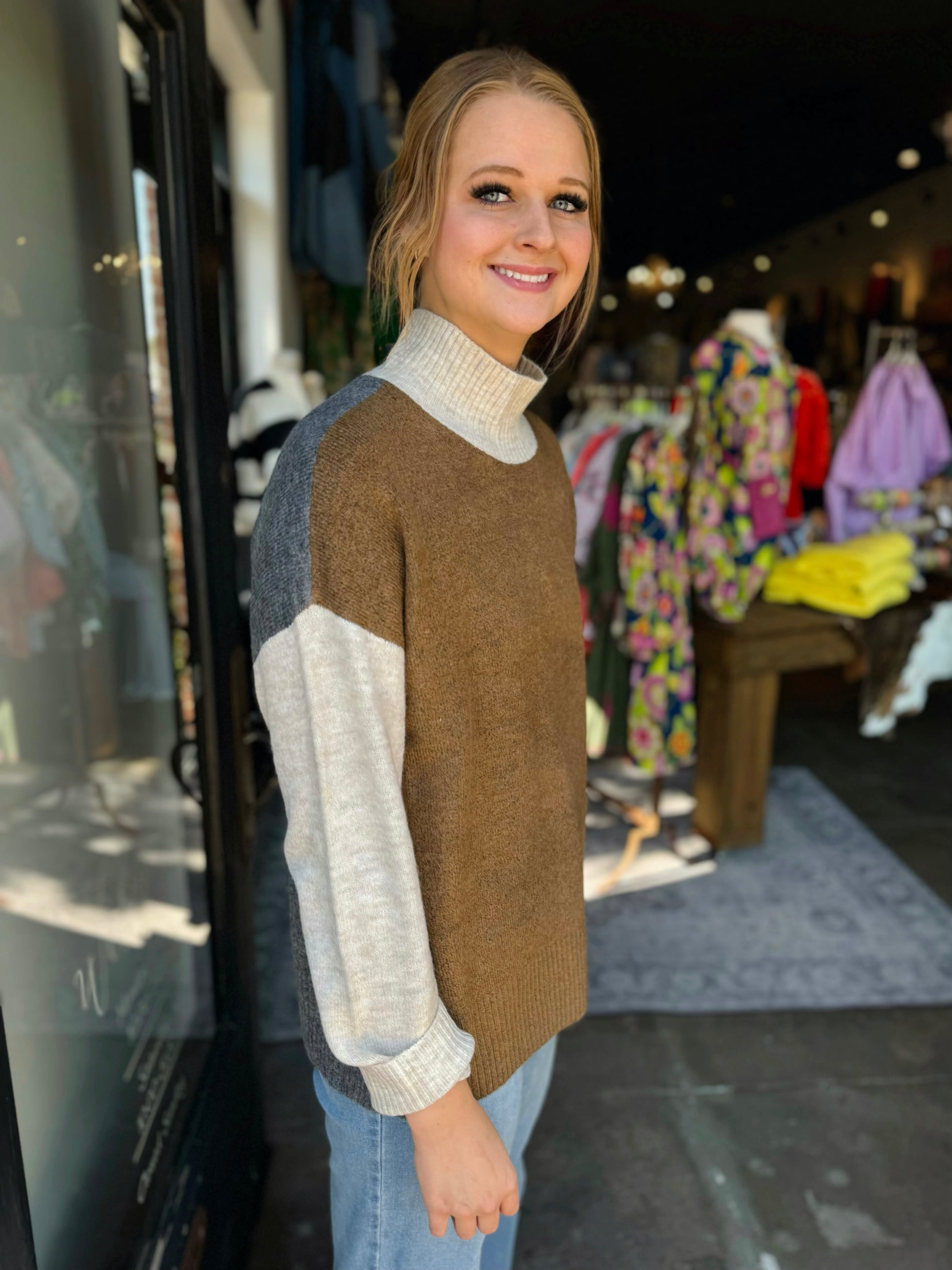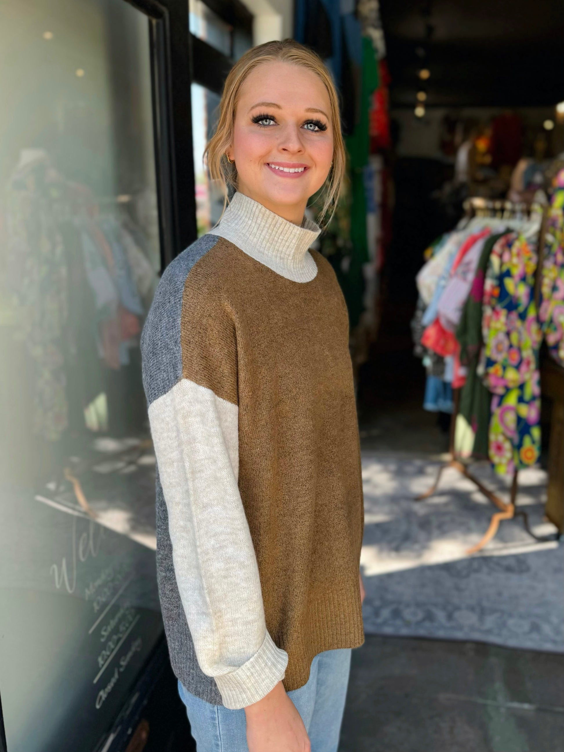 Make a statement with this sweater featuring a unique color block design and a classic mock neckline. This piece features a relaxed fit, long drop-shoulder, ribbed detailing at the neckline and cuffs. This is the perfect addition to elevate your wardrobe with effortless style!