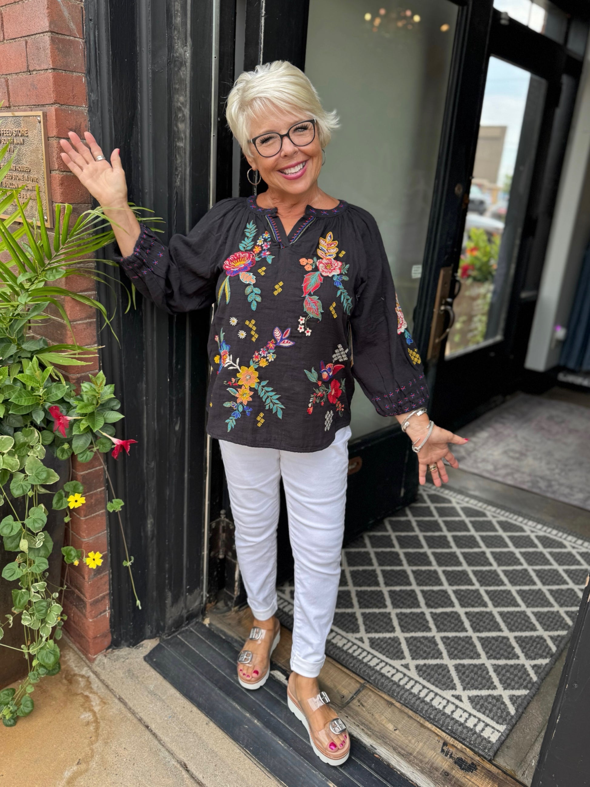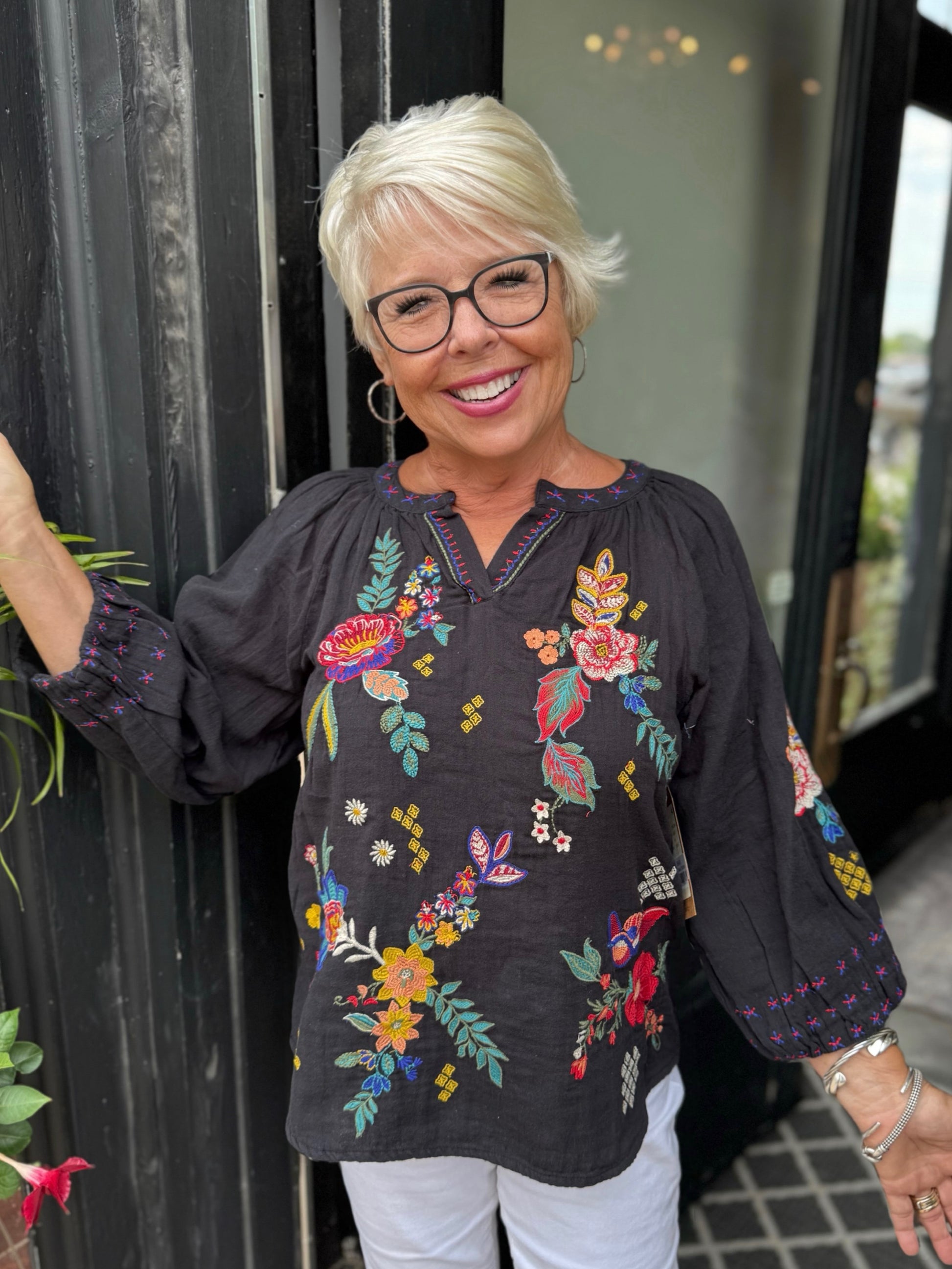 This black top features colorful floral embroidery, a split neckline, and relaxed sleeves for a chic boho-inspired look! Perfect for pairing with denim or white pants for effortless style!