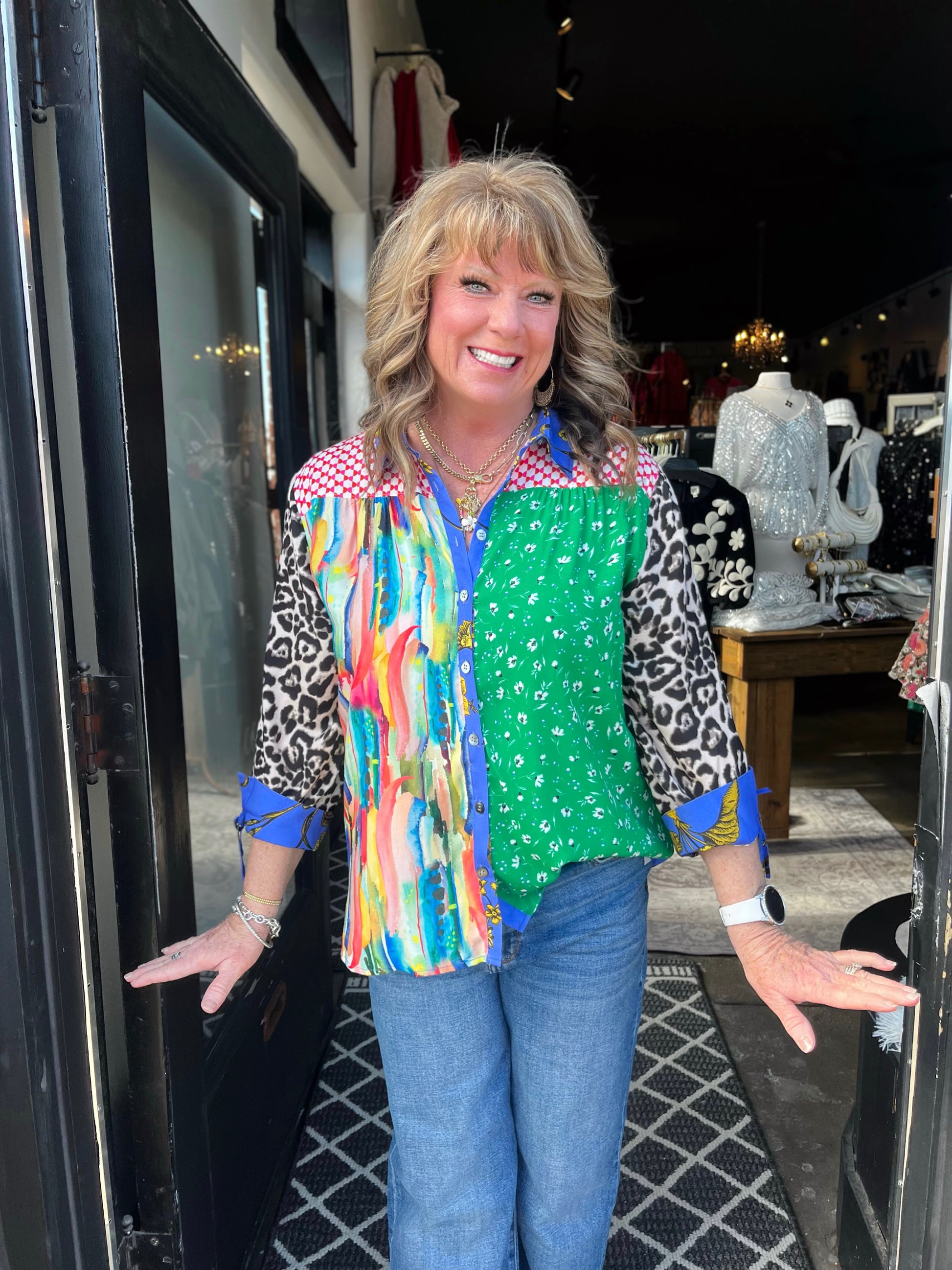 Add a pop of personality to your wardrobe with this mixed print button-up top. Crafted from soft, breathable fabric, it offers a comfortable and fluid fit. The drawstring sleeves provide a customizable touch, allowing you to adjust the fit for a more relaxed or gathered look. With its unique mix of prints, this top is sure to make a statement wherever you go.