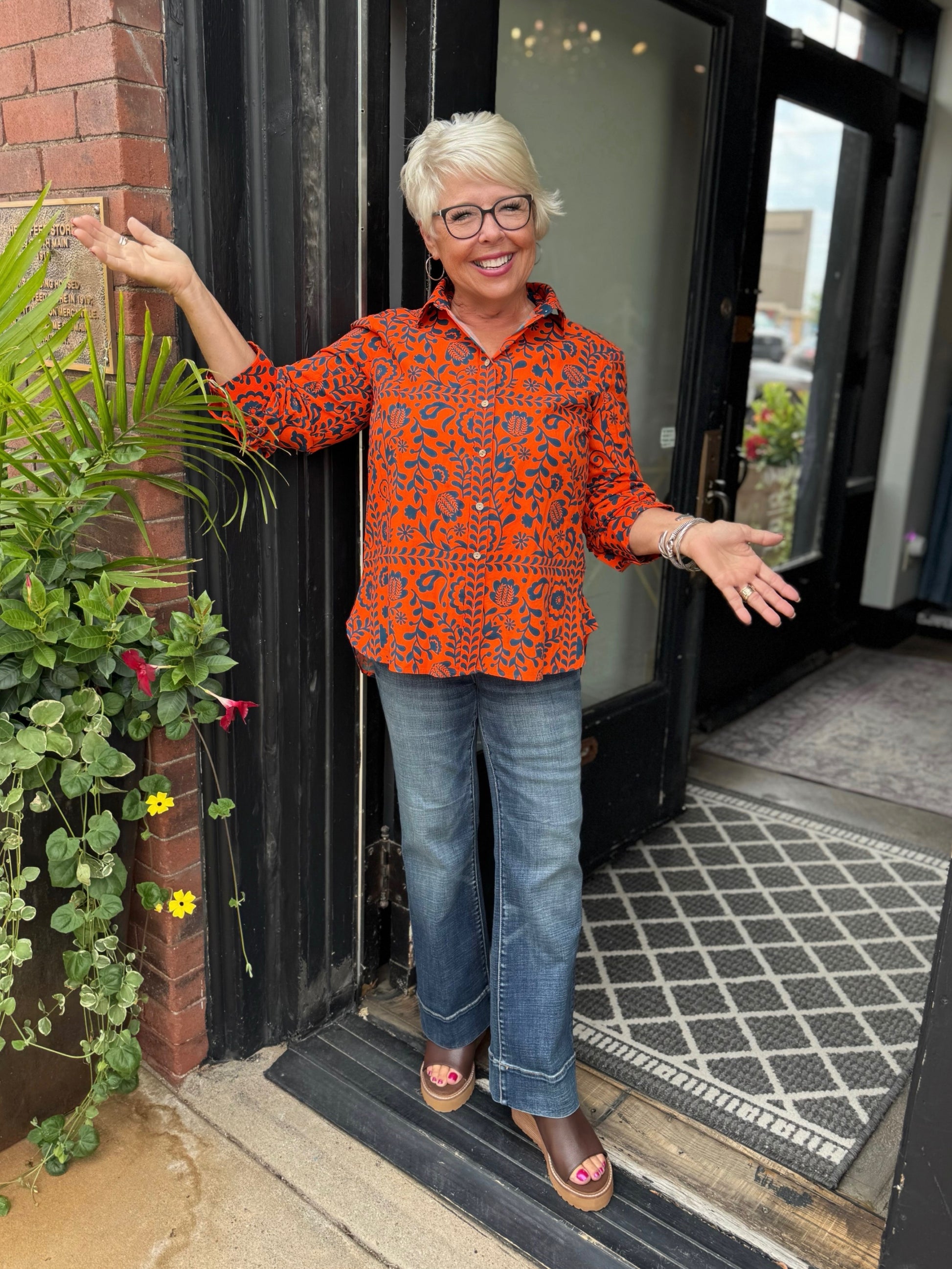 This vibrant button-down top features a bold orange base with striking navy floral designs, complete with a flattering fit and playful hemline! Perfect for adding a pop of color to your everyday style!