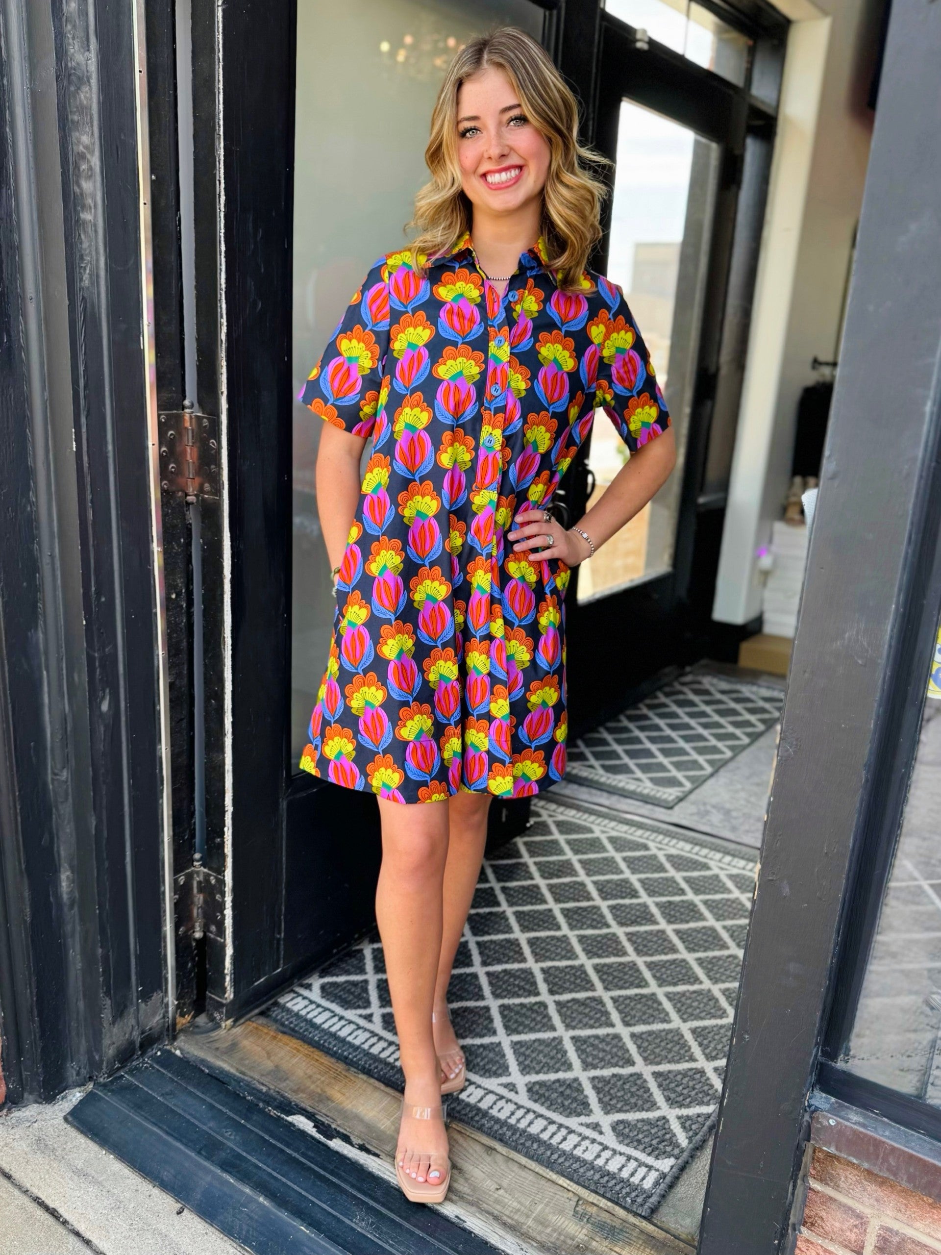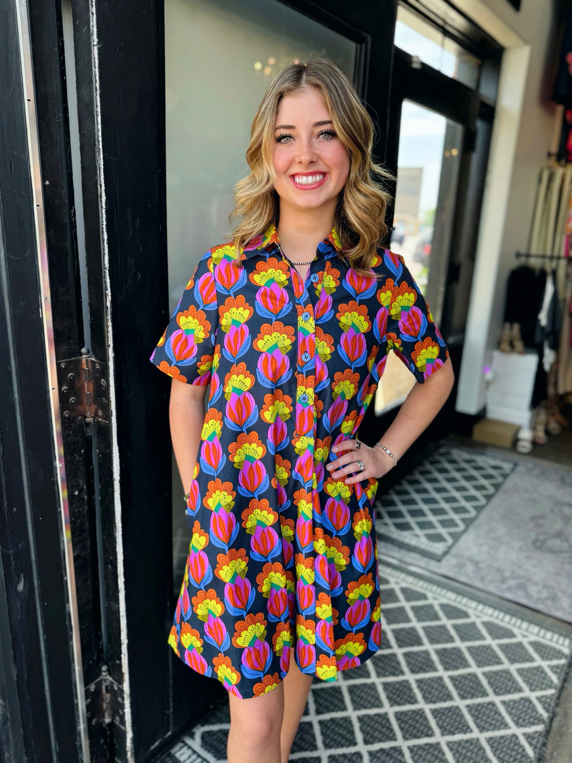 Step out in style with this vibrant button-down dress featuring a playful, retro-inspired floral print in shades of orange, yellow, purple, and pink. Crafted from a lightweight fabric, this short-sleeve dress offers a relaxed, flattering fit that’s perfect for warm days!
