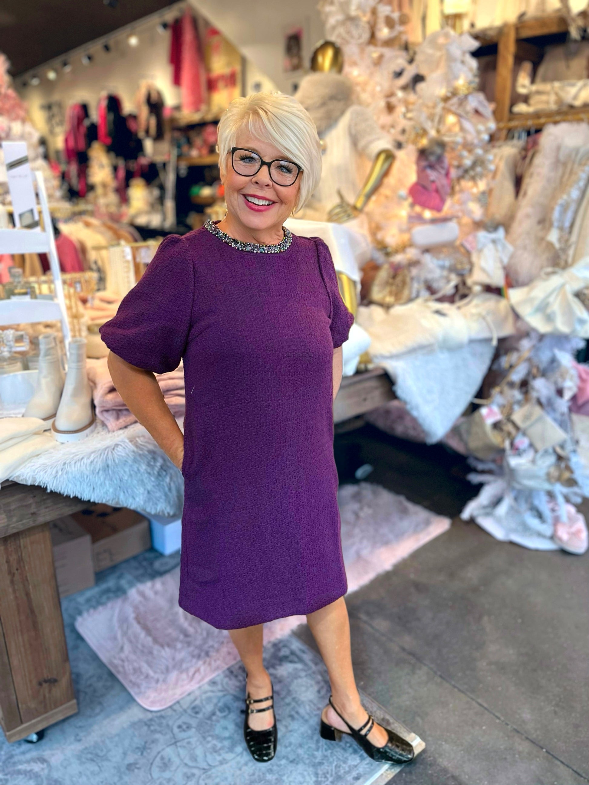 This elegant purple dress features a textured knit, sparkling embellished neckline, and softly puffed sleeves for a polished, elevated look! Its simple shift silhouette makes it a timeless and effortlessly chic piece for any occasion!