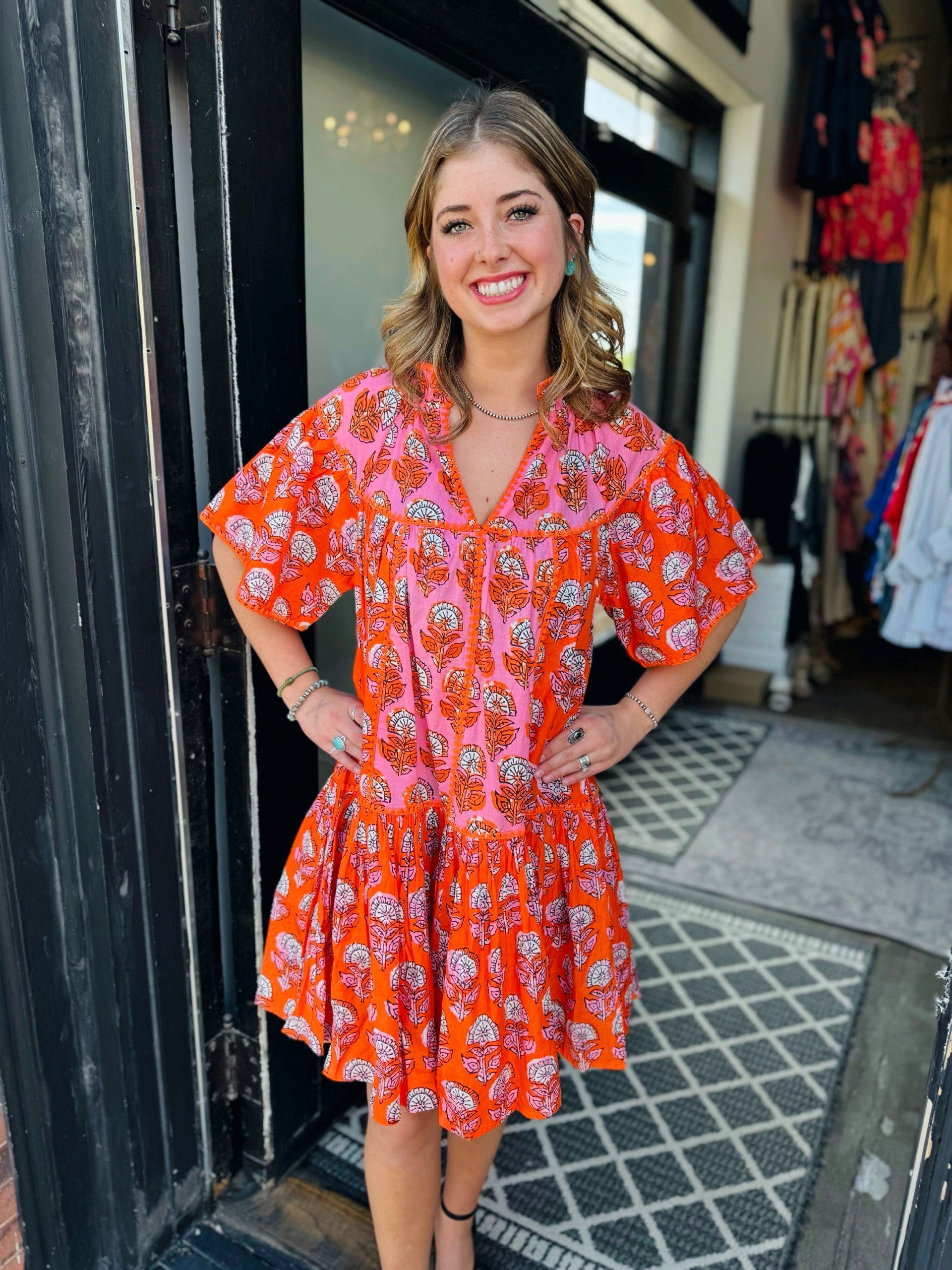 Brighten up any day with this eye-catching tiered dress, featuring a bold mix of orange and pink with a playful floral fan print. Designed with a flattering v-neckline, relaxed short sleeves, and a breezy, flared skirt, this dress is effortlessly fun and feminine!