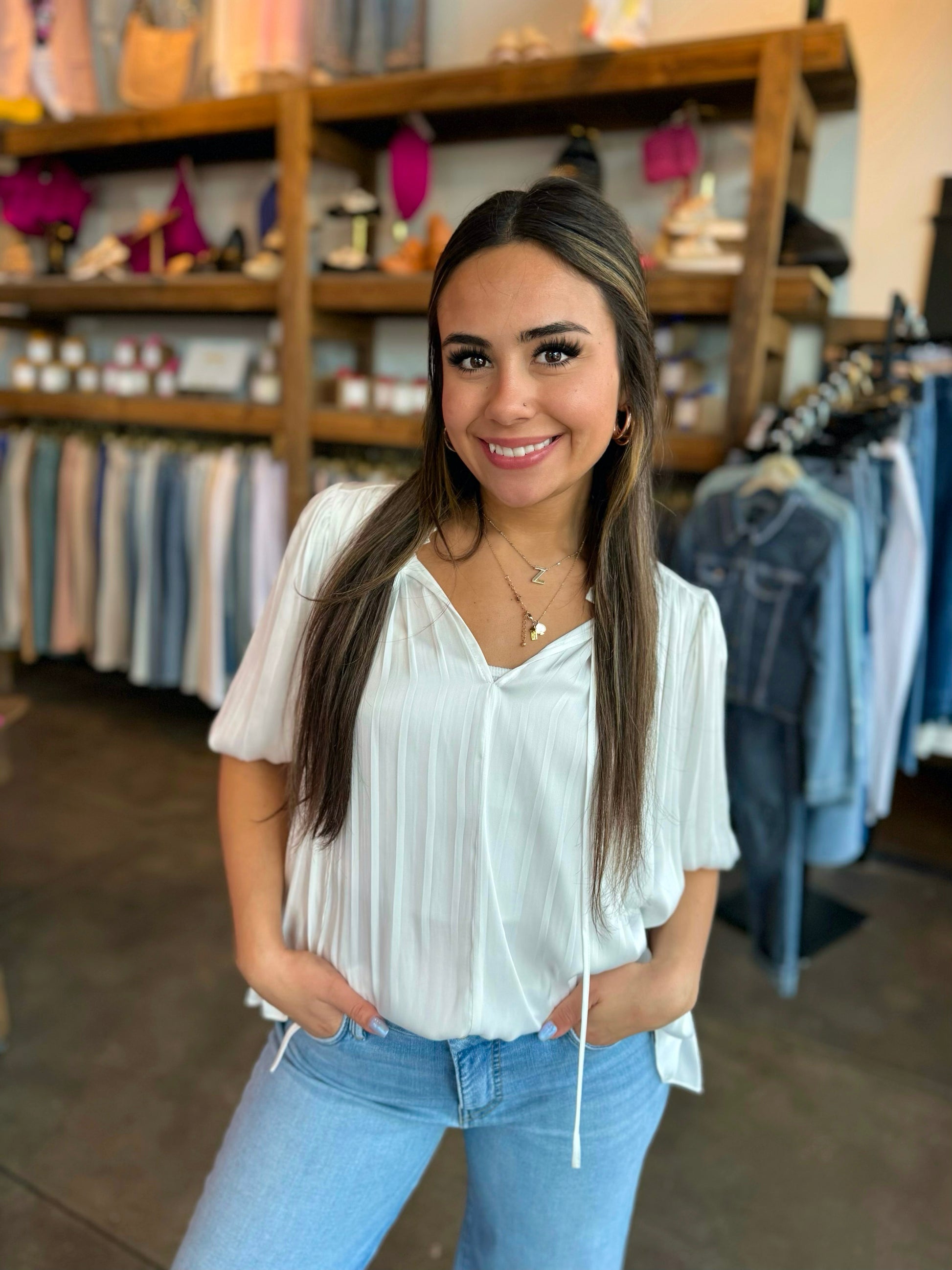 This split-neck blouse drapes elegantly on the figure, with gentle gathers and puffed sleeves enhancing the relaxed, flowy cut. Ruffle trim and a dainty tie neckline heighten the romantic effect!